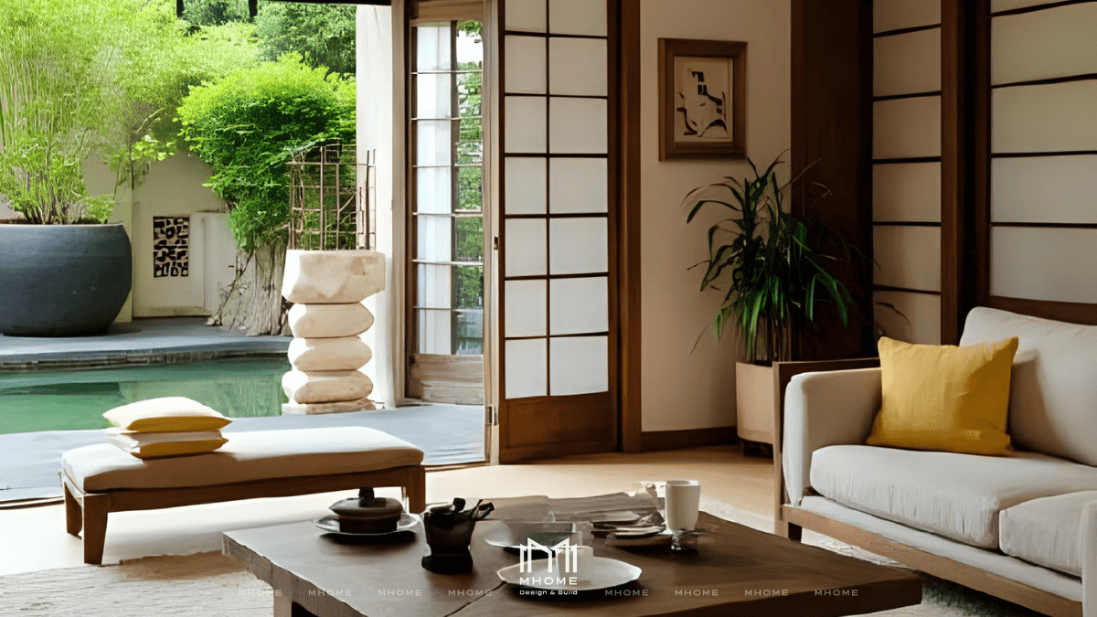- Vật liệu tự nhiên: Gỗ, tre, mây, giấy Shoji, đá cuội.