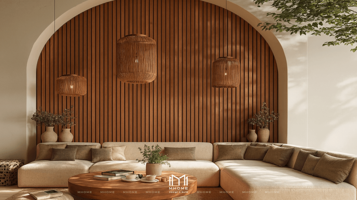 Sofa bọc vải màu be, chân thấp. Tường ốp gỗ sáng màu, trang trí thêm đèn thả trần tối giản. Không gian mở liền kề phòng ăn.