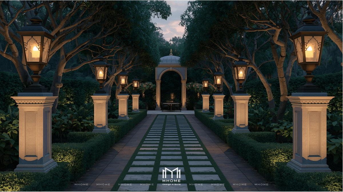 - Đặt đèn lối đi cách đều và thấp để ánh sáng không gây chói.